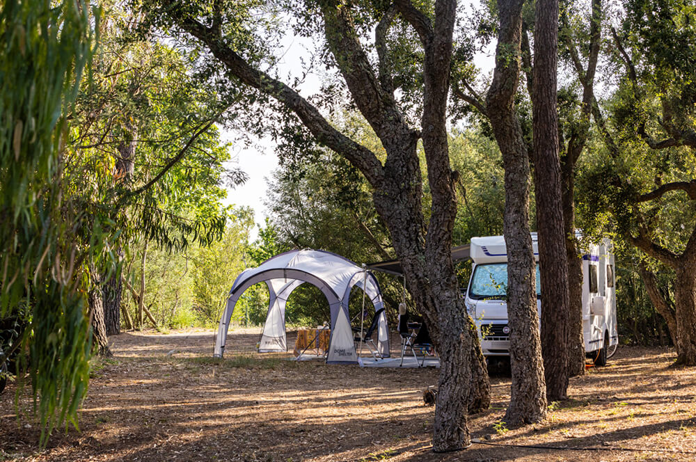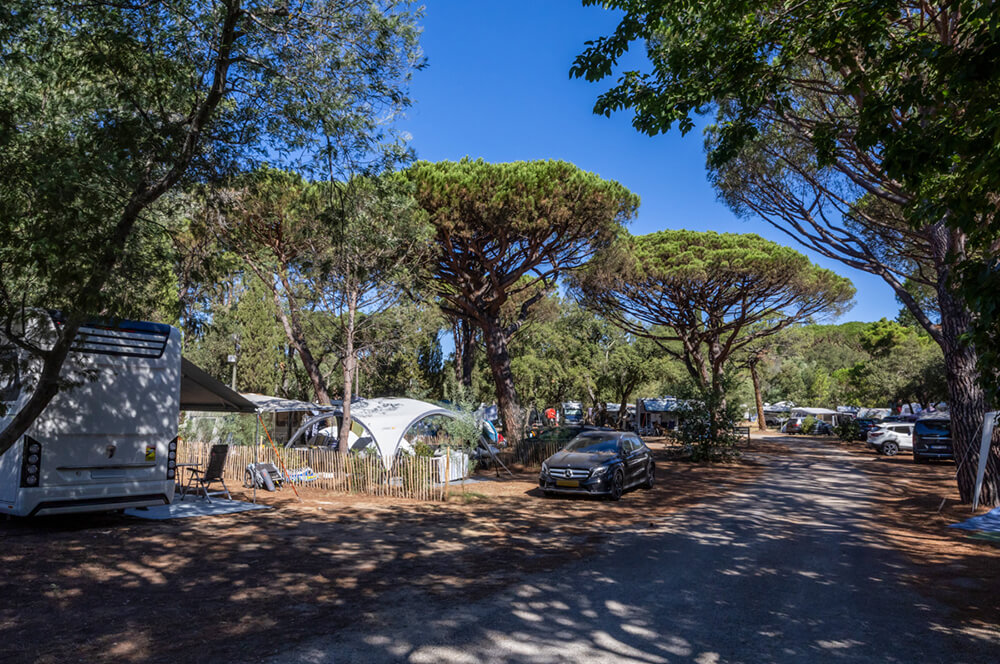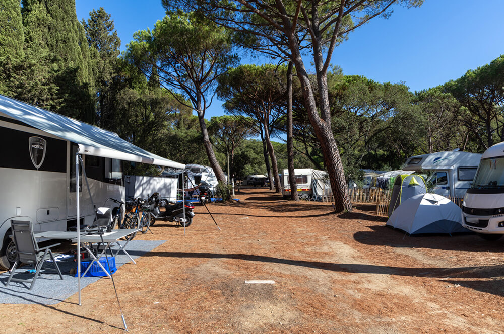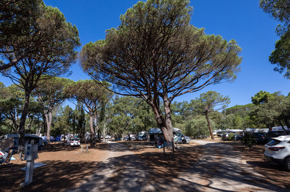 Auf der Meerseite befinden sich die Rezeption, das Lebensmittelgeschäft, die Restaurants, drei Sanitärblöcke mit Duschen und drei Entleerungsstationen, eine davon für XXL-Installationen. Auf der Waldseite befinden sich die Freizeitbereiche, vier Sanitärblöcke mit Duschen und drei Entleerungsstationen, eine davon für XXL-Installationen.